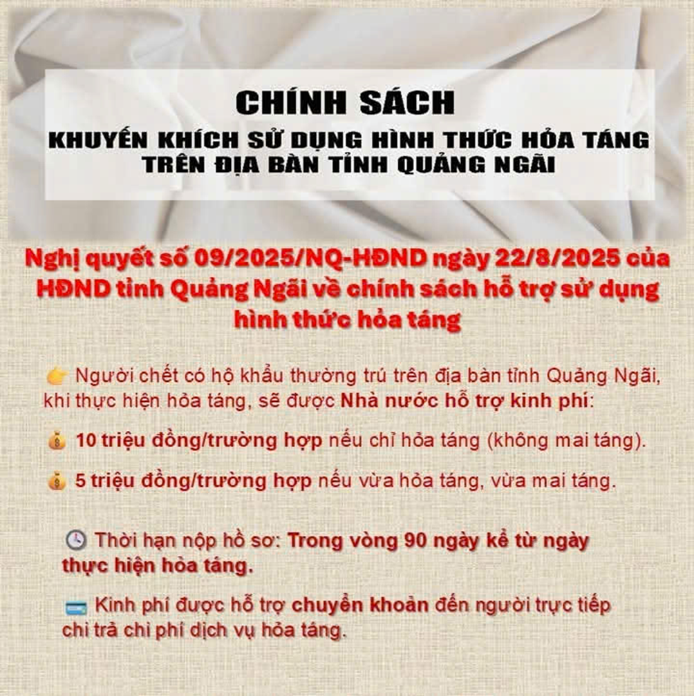 HĐND tỉnh Quảng Ngãi ban hành Nghị quyết 09/2025/NQ-HĐND ngày 22/8/2025 Quy định chính sách hỗ trợ để khuyến khích sử dụng hình thức hỏa táng trên địa bàn tỉnh Quảng Ngãi.