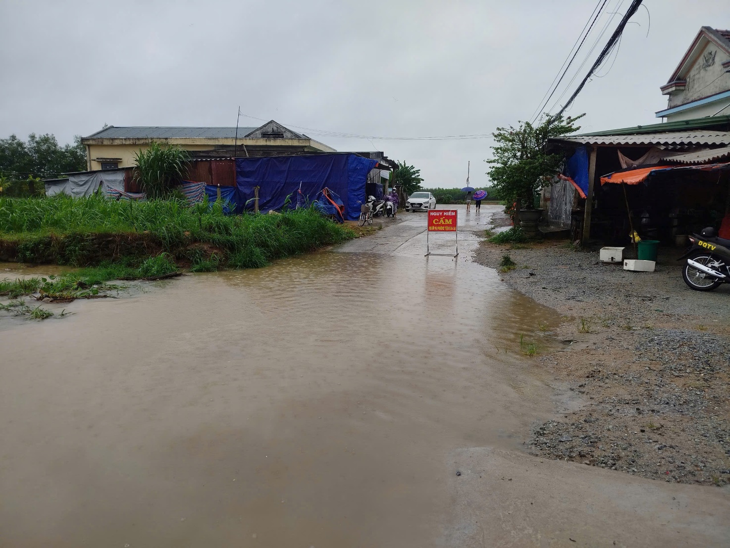 Đoạn ở xóm 3, thôn Thọ Bắc ngập nước, địa phương cắm biển cảnh báo cấm người và phương tiện qua lại |