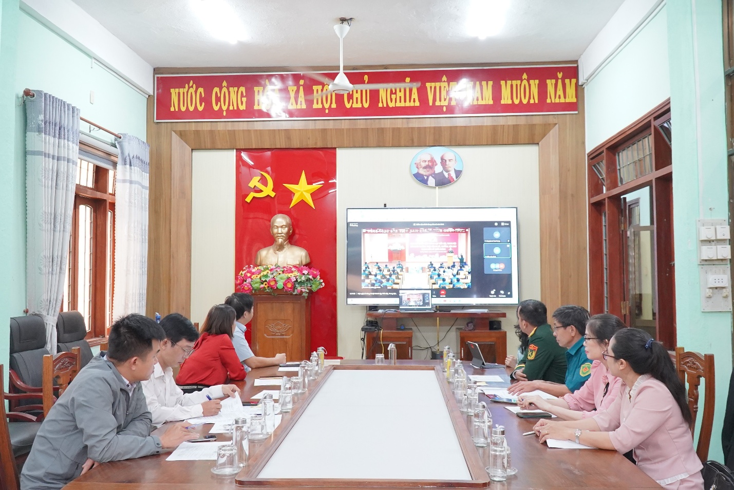 Dự tại điểm cầu xã Thọ Phong, có đồng chí Thiếu tá Nguyễn Tuấn Anh – Trợ lý pháo binh Ban Chỉ huy phòng thủ khu vực 1 – Sơn Tịnh; đồng chí Huỳnh Thị Sương – Bí thư Đảng ủy, Chủ tịch HĐND xã; đồng chí Trương Công Hòa – Phó Bí thư Đảng ủy, Chủ tịch UBND xã.